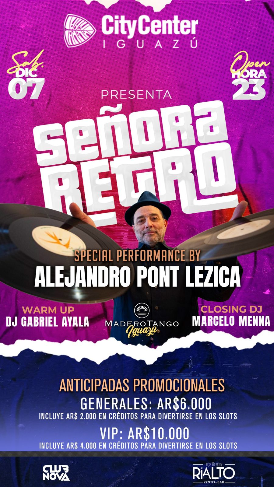 El sábado 7 de diciembre, el prestigioso salón Madero Tango Iguazú será el escenario de #SeñoraRetro, una fiesta inolvidable para cerrar el 2024. Alejandro Pont Lezica, ícono de la música retro en Argentina, hará vibrar a los asistentes con éxitos que marcaron generaciones.